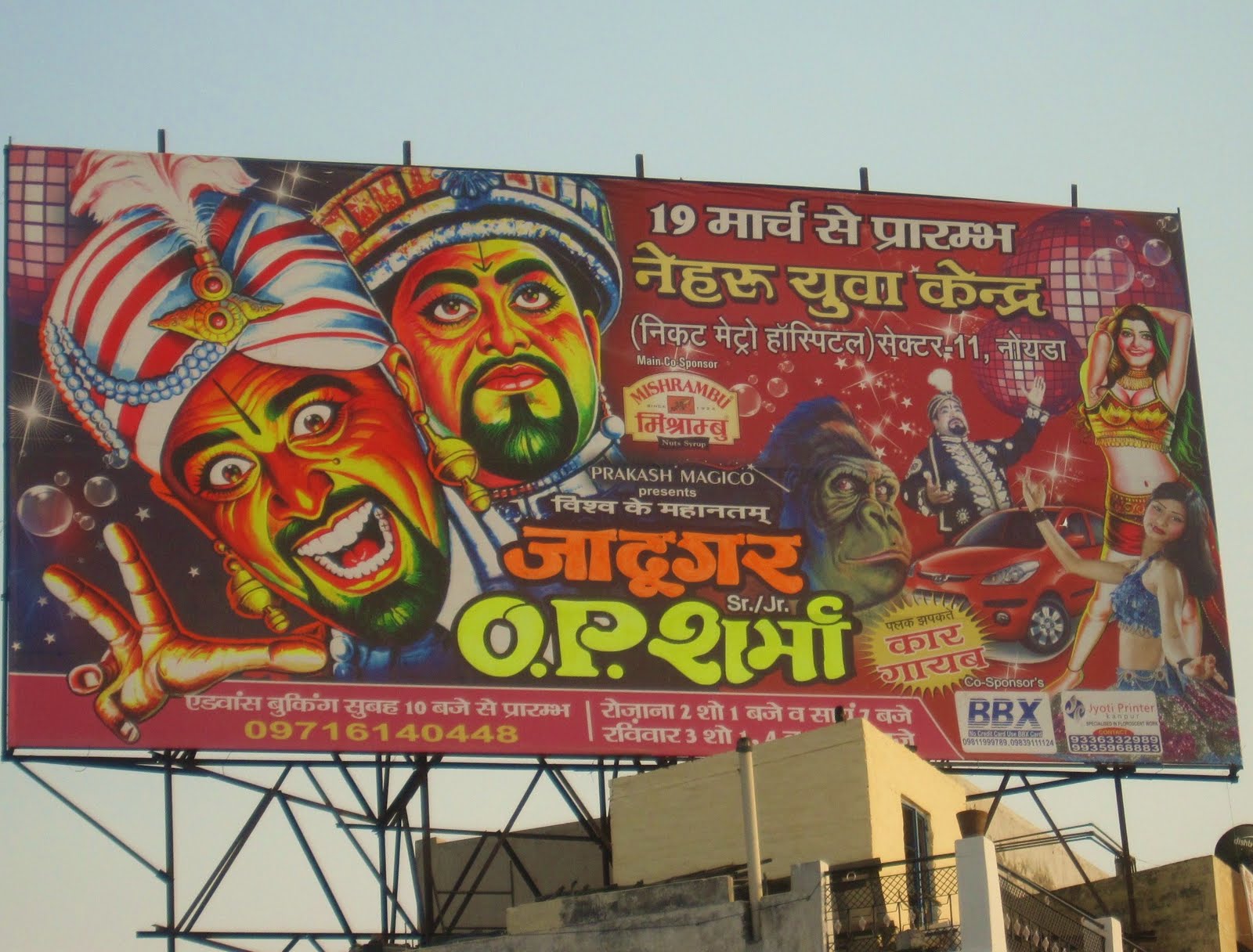 OPシャルマというマジックショーだそうです。この雰囲気たまりません。右側の精一杯頑張ってるお姉ちゃんとか車とかゴリラとか一体何なんでしょう?これが本当のインド大魔術でしたが残念ながら見に行くことはできませんでした。